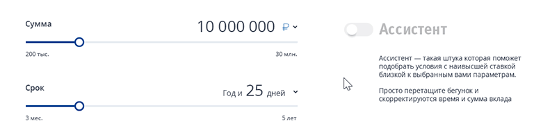 Ассистент — предлагает пользователю скорректировать срок и сумму вклад в зависимости от заданных параметров.